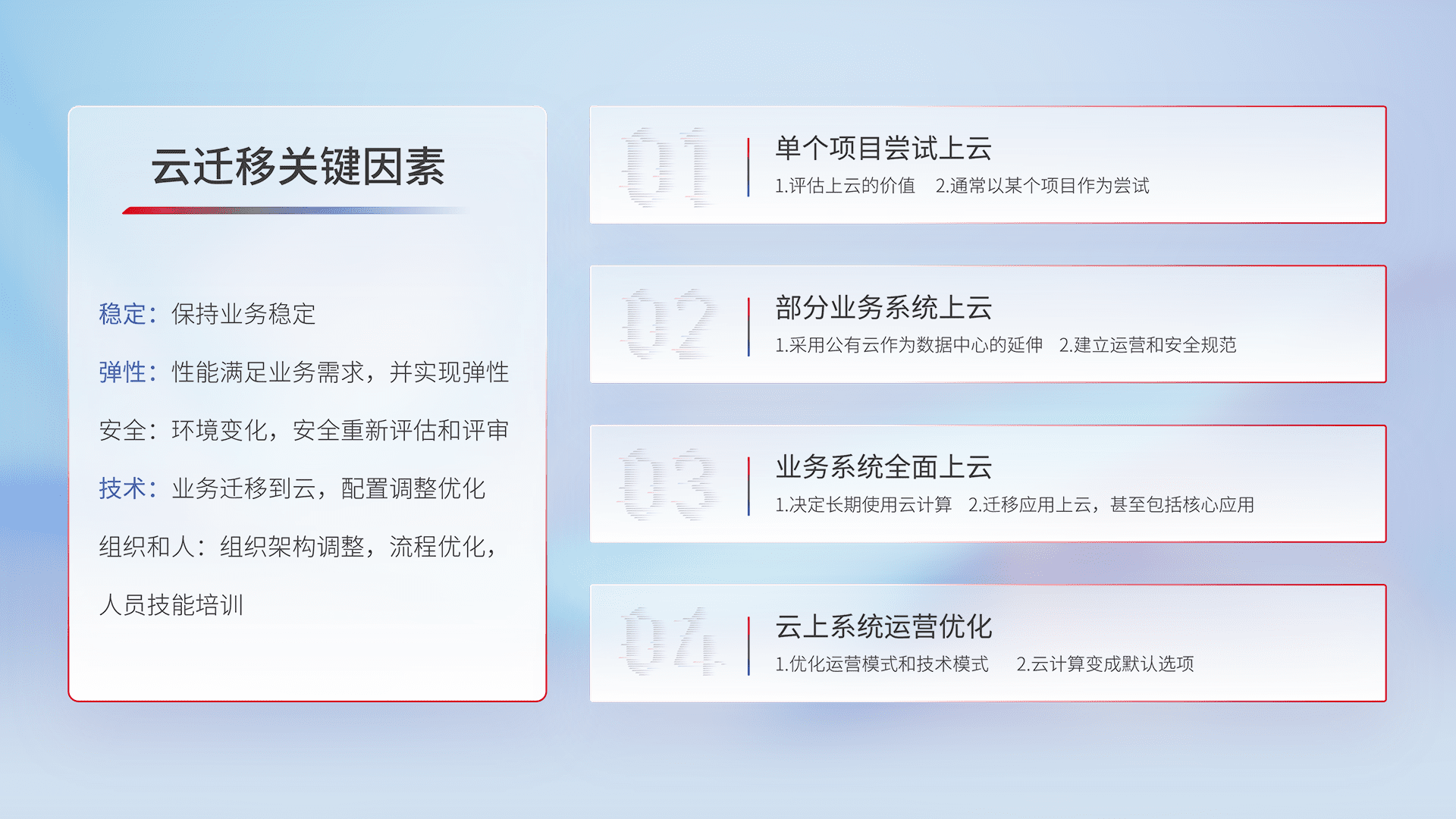 结合实际业务,,,,从规划设计、、、、云平台选型、、、、云原生改造、、、、数据迁移、、集成交付,,迁移全过程为客户识别最佳上云路径,,,做好风险识别管理,,,设计网络架构、、身份权限、、、安全审计合规、、操作审计、、、日志审计、、监控告警策略、、多站点容灾设计等,,,,对云上基础设施进行整体规划,,,,提升IT治理水平,,,以满足弹性、、、高可用、、、、高性能的需求。。。