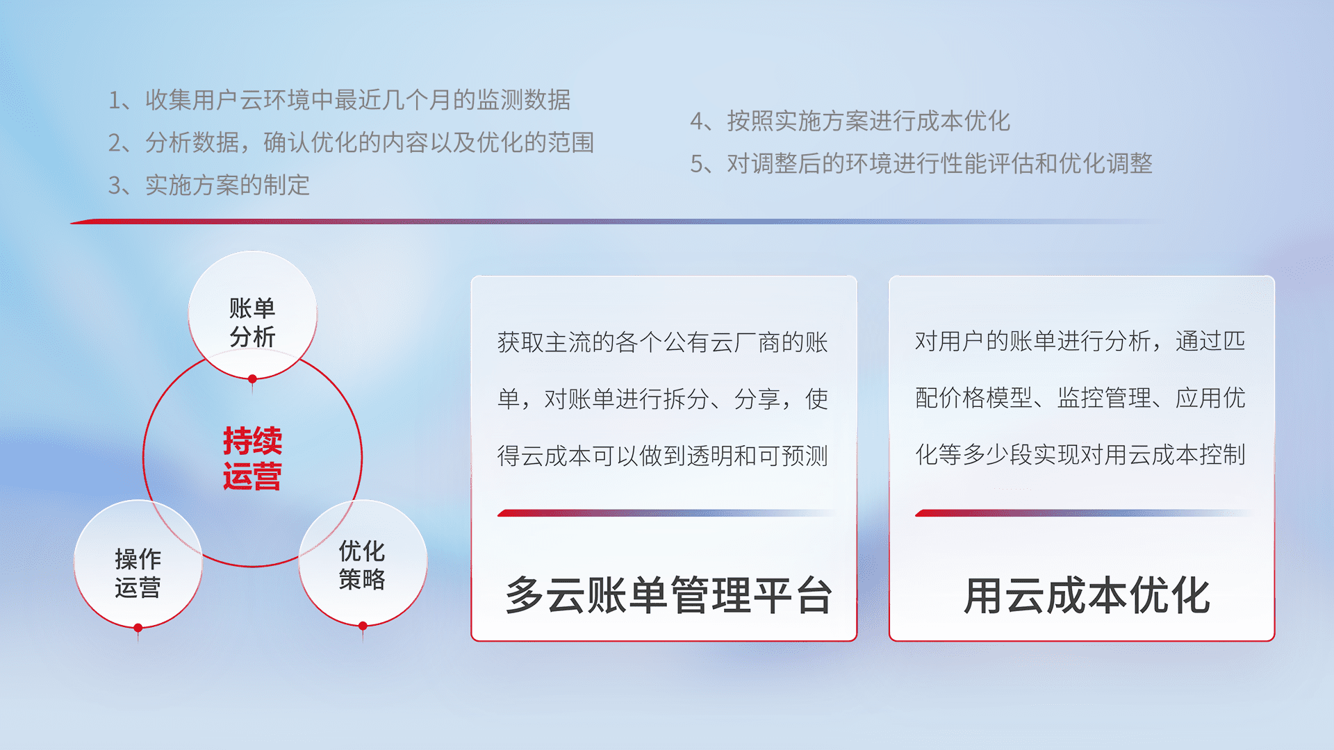 通过多云纳管,,,以统一的资源数据模型把客户的云资源进行抽象和封装,,,,进而实现对多云资源的统一操作,,保障云资源管理的可靠性、、稳定性与可用性。。。量身定制化运维内容,,配置、、、、开发运维、、补丁管理、、备份、、、、监控、、认证和访问管理、、、审计和日常巡检等,,,,保障在用云过程中的可靠度,,,稳定度以及高可用率。。。
