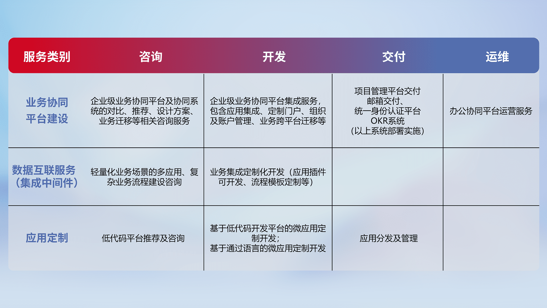 针对钉钉、、企微、、、IDaas等平台级产品提供产品的规划、、、方案、、交付、、定制化开发等服务,,实现如统一协同办公、、智能客户服务、、、混合会议管理、、、智能数据查询、、等业务场景,,,实现数字化转型。。